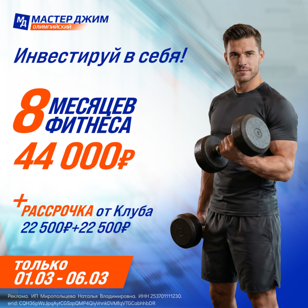 Фитнес-клуб «Мастер Джим Олимпийский» дарит праздничное настроение и СКИДКУ 3 000 рублей на покупку годовой карты!